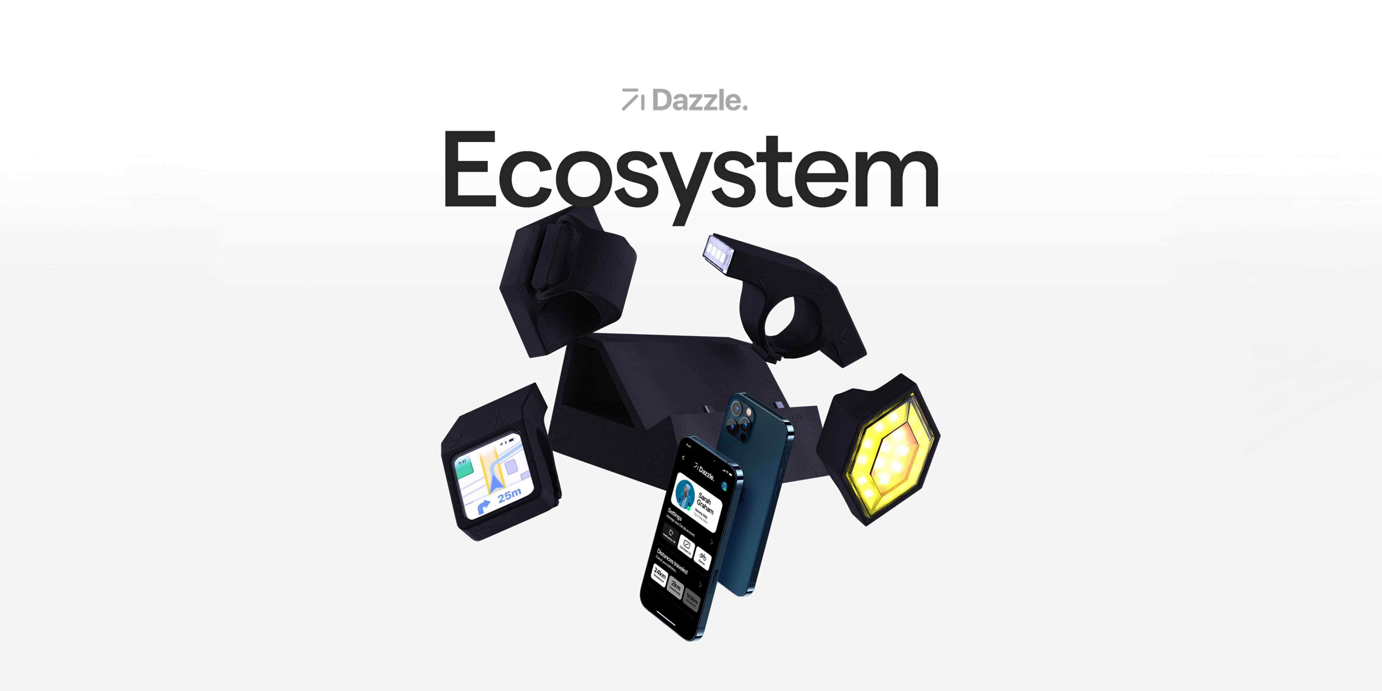 Dazzle Ecosystem è stato sviluppato con l'obiettivo di eliminare le barriere che rendono pericoloso il ciclismo urbano e che distraggono i ciclisti. La soluzione si basa su un ecosistema di prodotti e servizi interconnessi, progettati per rendere la guida più sicura e permettere al ciclista di concentrarsi pienamente sul percorso. Il sistema include Front Light e Back Light, una coppia di luci per bicicletta capaci di autoregolarsi attraverso la companion App.